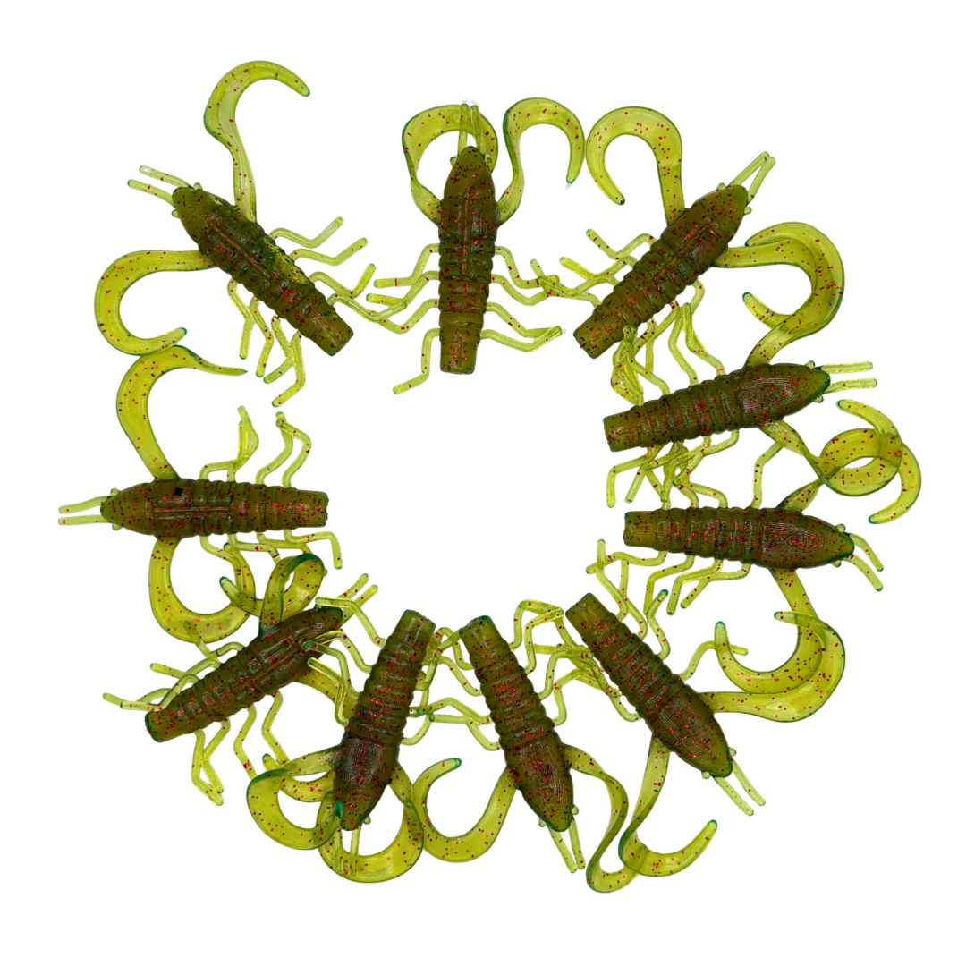 "The lil bugger" can be used in conjunction with the following fishing techniques: Carolina Rig (must try technique with this particular soft bait), Texas Rig, as a jig trailer, weightless, and even on power drop shots. Fish of all kinds are tricked into feeding and/or striking this realistic creature-craw artificial lure and due to the secondary action of appendages anglers who thrive in clear, stained, or dirty water can all benefit from using this innovative twist on creature baits.